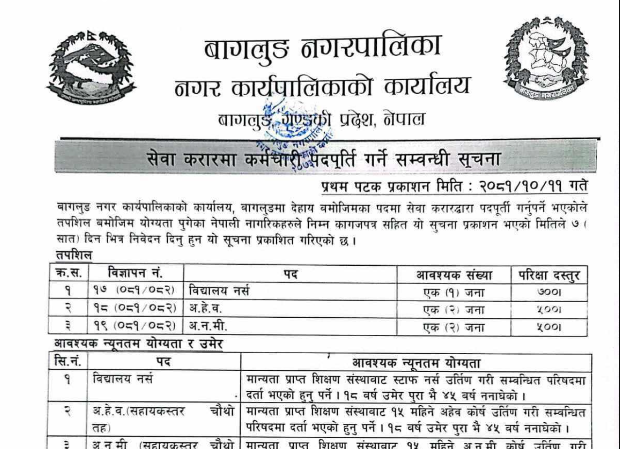 बागलुङ नगरपालिका बागलुङमा विद्यालय नर्स, अ.हे.व. र अ.न.मी. आवश्यकता सम्बन्धी सूचना