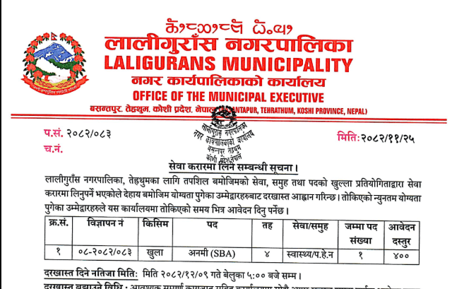 Vacancy Announcement for ANM at Laligurans Municipality, Tehrathum