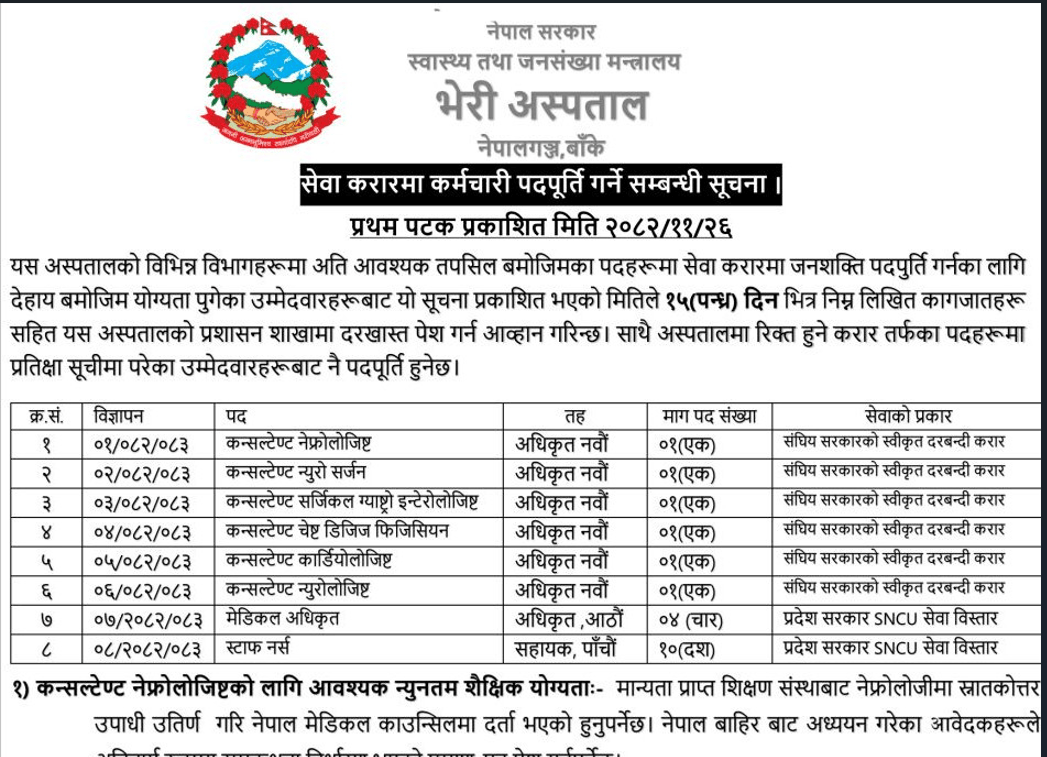 Bheri Hospital Nepalganj, Vacancies for Various Pots