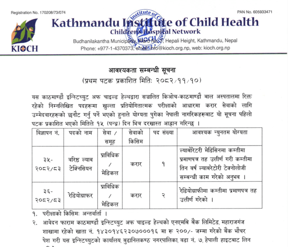 Vacancy Announcement for Sr. Lab Technician and Radiographer for KIOCH-Kathmandu Children’s Hospital