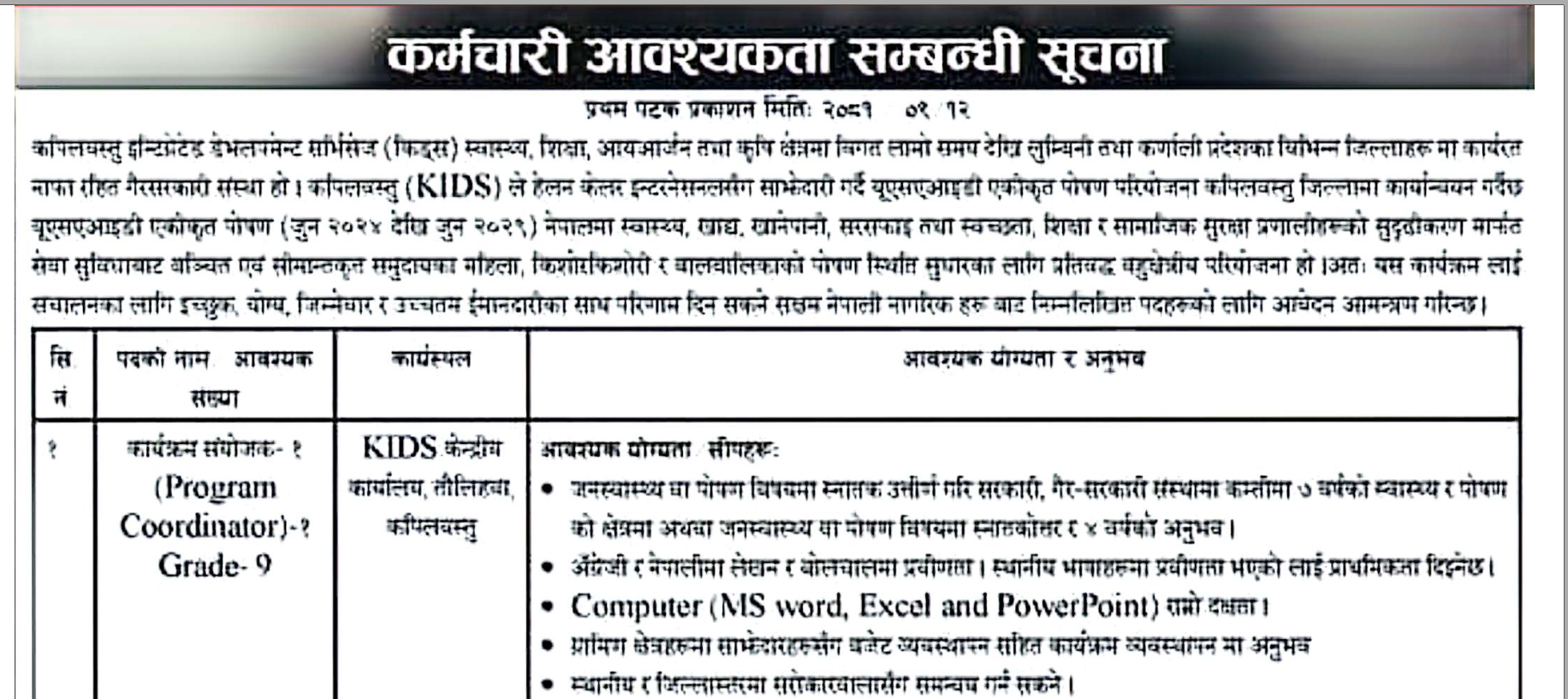 KIDS मा एकीकृत पोषण परियोजनाको लागि कर्मचारी आवश्यकता सम्बन्धी सूचना !