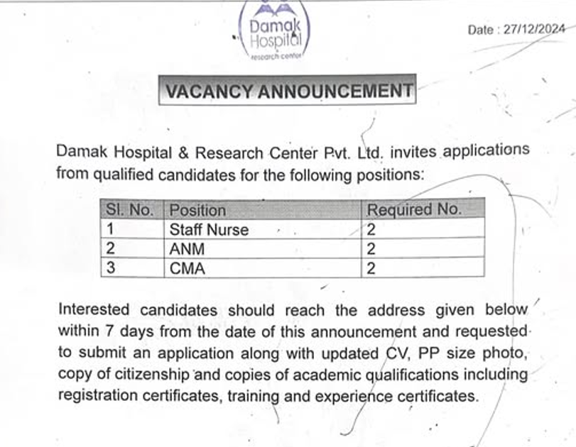 Vacancy Announcement at Damak Hospital & Research Center for SN, AHW and ANM