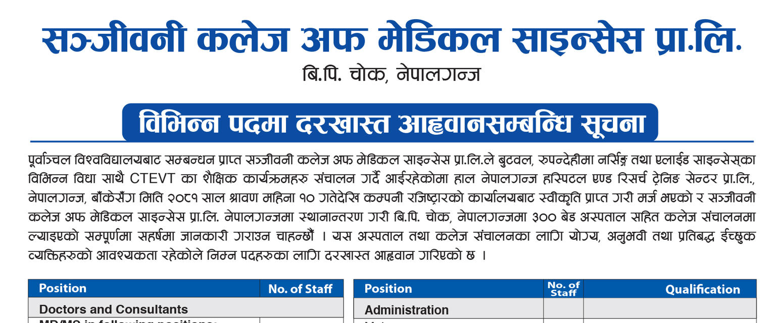 नेपालगञ्जमा रहेको सञ्जीवनी कलेज अफ मेडिकल साइन्सले विभिन्न पदमा ८२३ जना जनशक्ति माग गरेको छ।