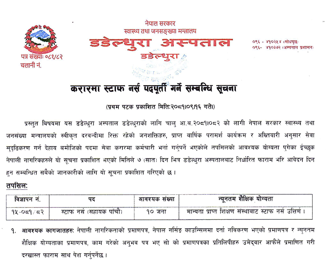 डडेल्धुरा अस्पतालमा १० जना स्टाफ नर्स आवश्यकता