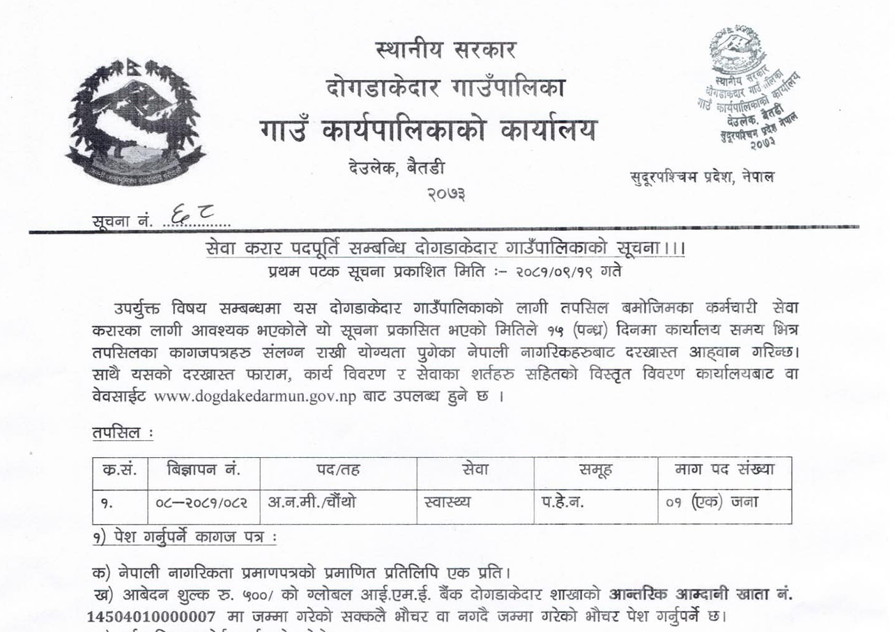 दोगडाकेदार गाउँपालिकामा अ.न.मी. आवश्यकता सम्बन्धी सूचना !
