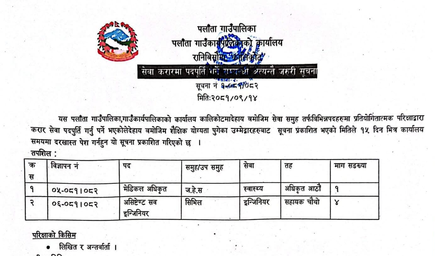 पलाँता गाउँपालिकामा कर्मचारी आवश्यकता सम्बन्धी सूचना