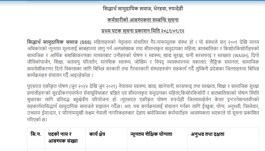सिद्धार्थ सामुदायिक समाज, भैरहवामा कर्मचारीआवश्यकता सम्बन्धी सूचना