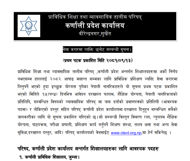 CTEVT कर्णाली प्रदेशकाे : सेवा करारमा लिने सम्बन्धी सूचना