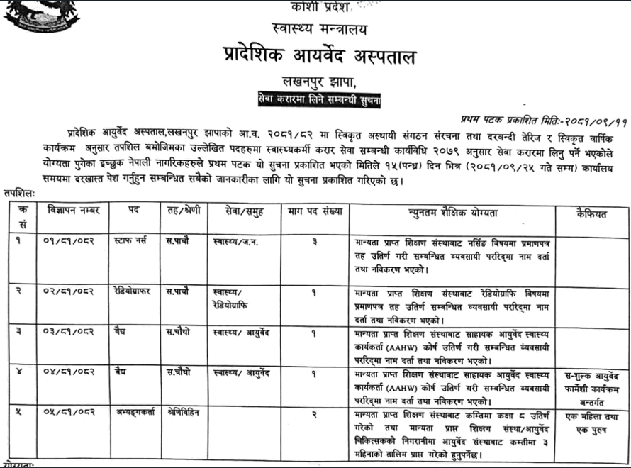 प्रदेश आयुर्वेद अस्पताल झापामा कर्मचारी आवश्यकता सम्बन्धी सूचना