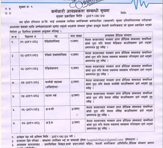 छाँया हस्पिटल सन्धिखर्कमा कर्मचारी आवश्यकता सम्बन्धी सूचना