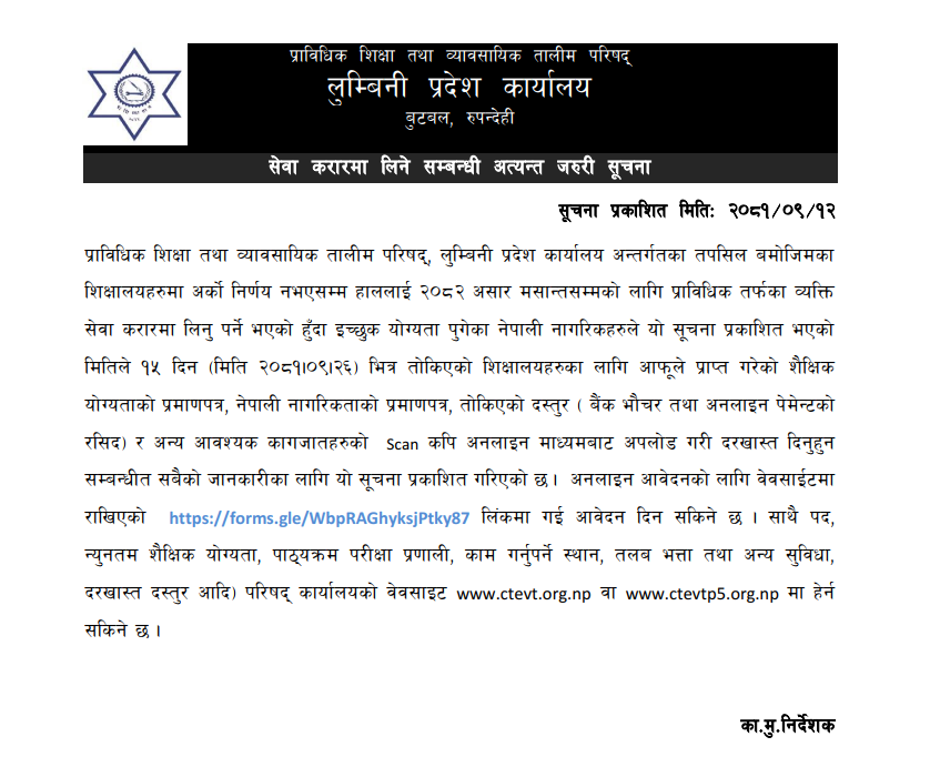 CTEVT लुम्बिनी प्रदेशकाे : सेवा करारमा लिने सम्बन्धी सूचना