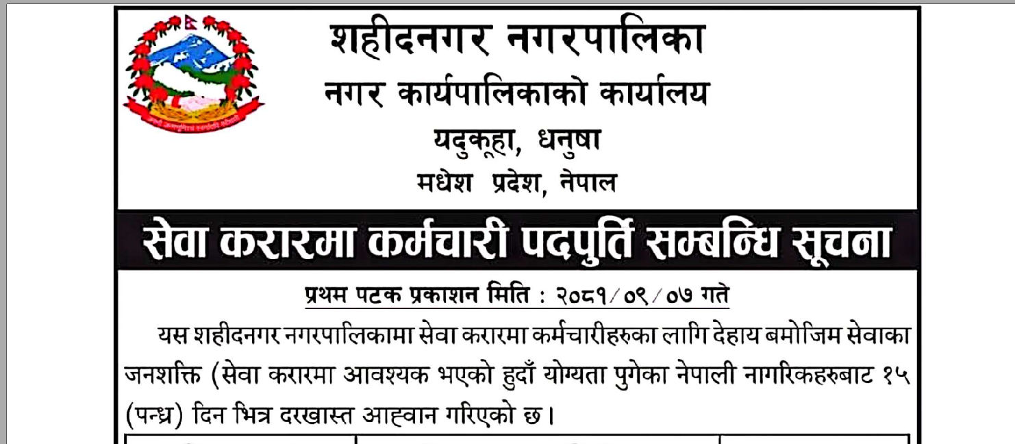 शहिद नगरपालिका यदूकूहा धनुषामा कर्मचारी आवश्यकता सम्बन्धी सूचना