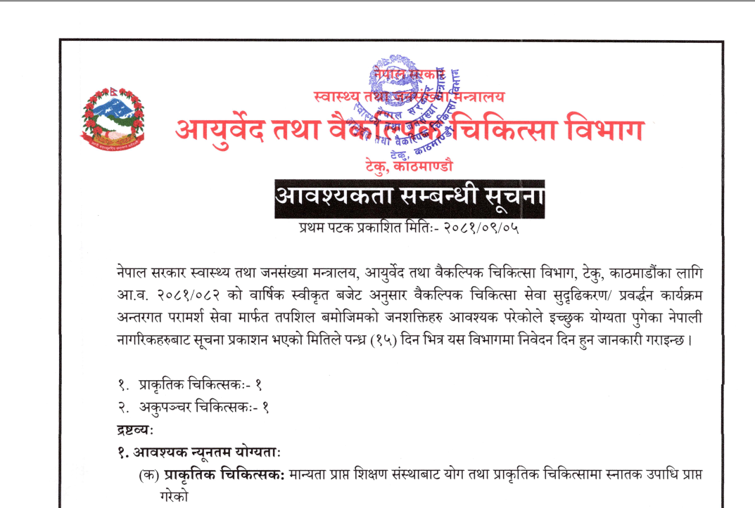 आयुर्वेद तथा वैकल्पिक चिकित्सा विभागको कर्मचारी आवश्यकता सम्बन्धी सूचना