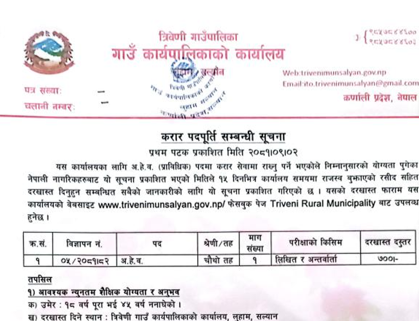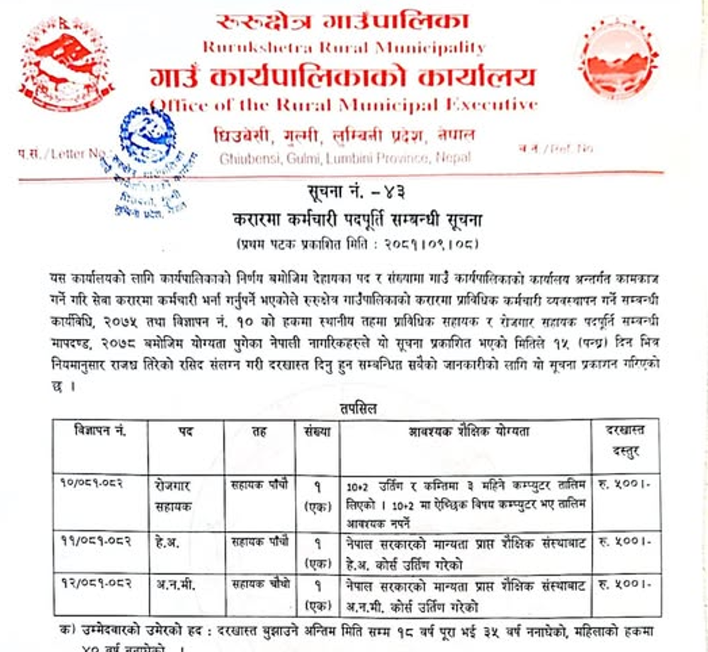 रुरुक्षेत्र गाउँपालिका गुल्मीमा कर्मचारी आवश्यकता सम्बन्धी सूचना