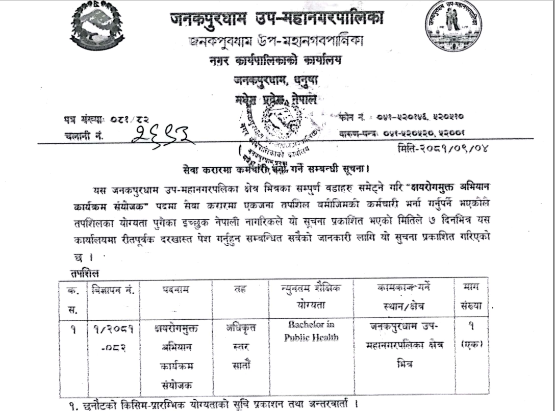जनकपुरधाम उपमहानगरपालिकामा क्षयरोगमुक्त अभियान कार्यक्रम संयोजक आवश्यकता सम्बन्धी सूचना