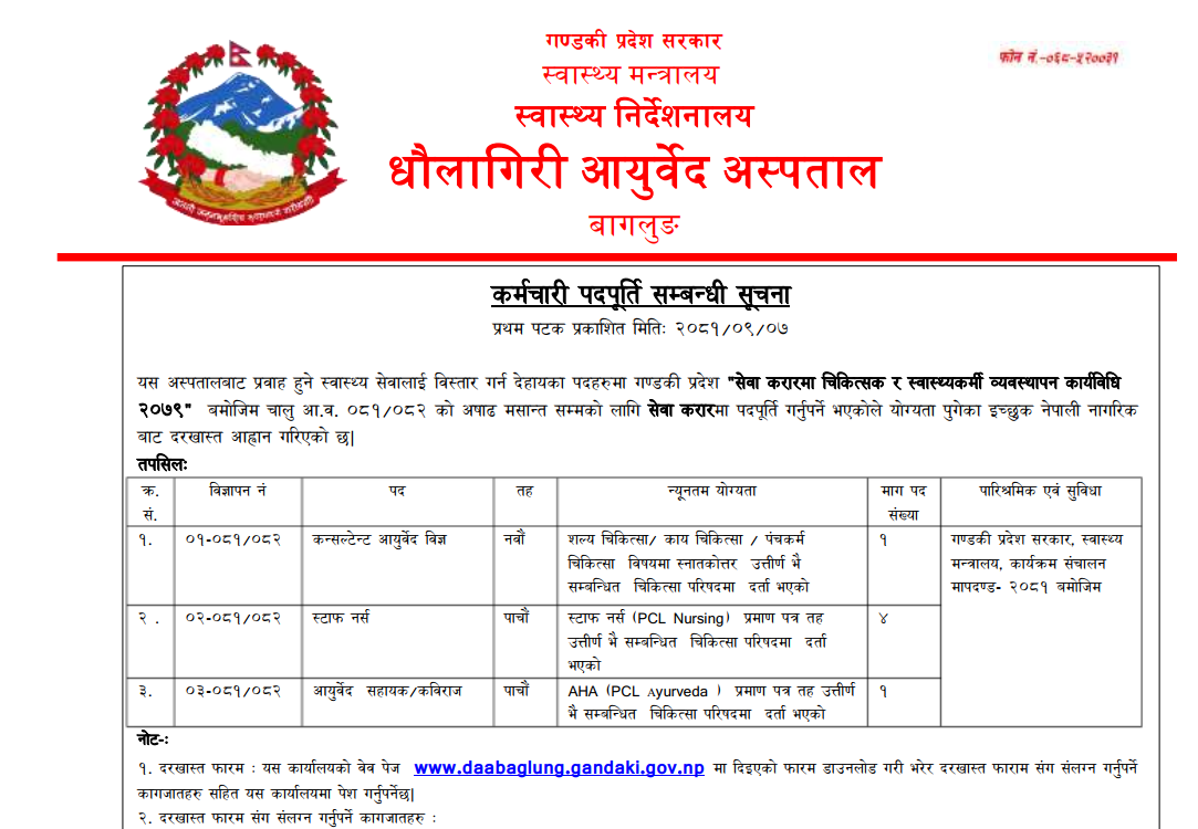 धौलागिरी आयुर्वेद अस्पतालमा कर्मचारी आवश्यकता सम्बन्धी सूचना