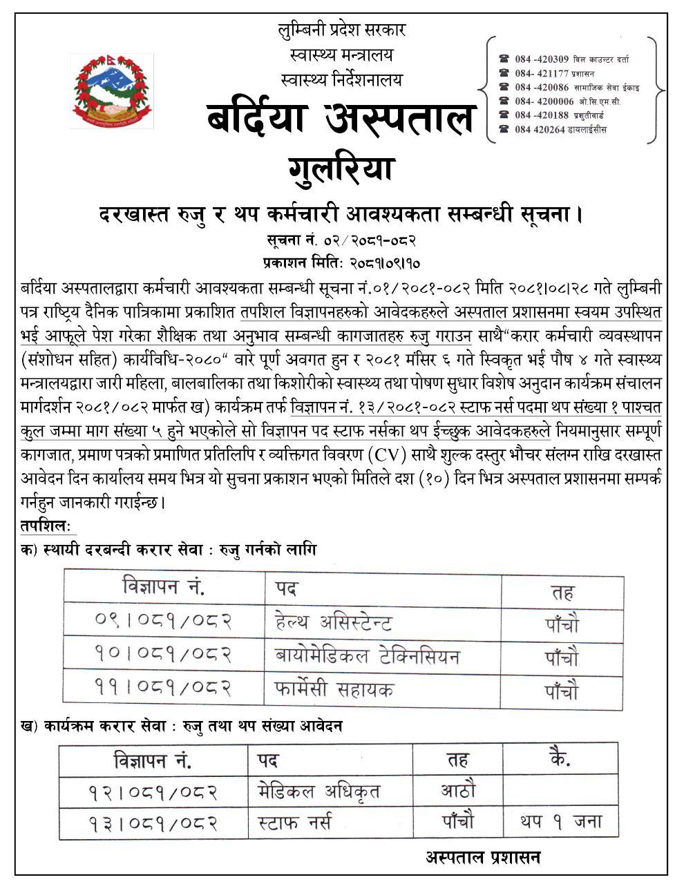 बर्दिया अस्पतालमा कर्मचारी आवश्यकता सम्बन्धी सूचना