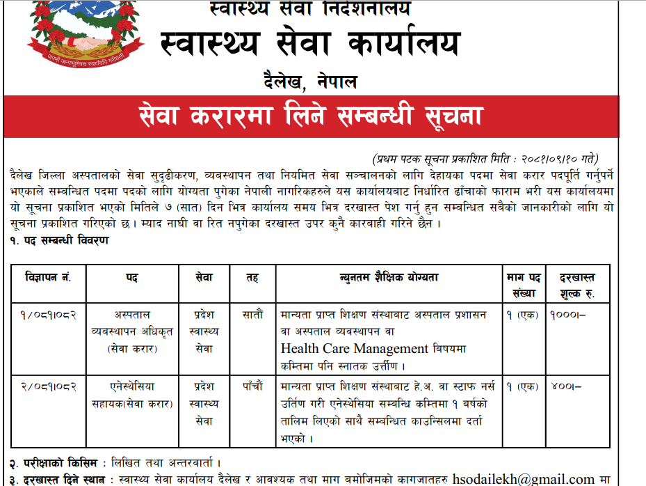 स्वास्थ्य सेवा कार्यालय दैलेखमा कर्मचारी आवश्यकता सम्बन्धी सूचना !