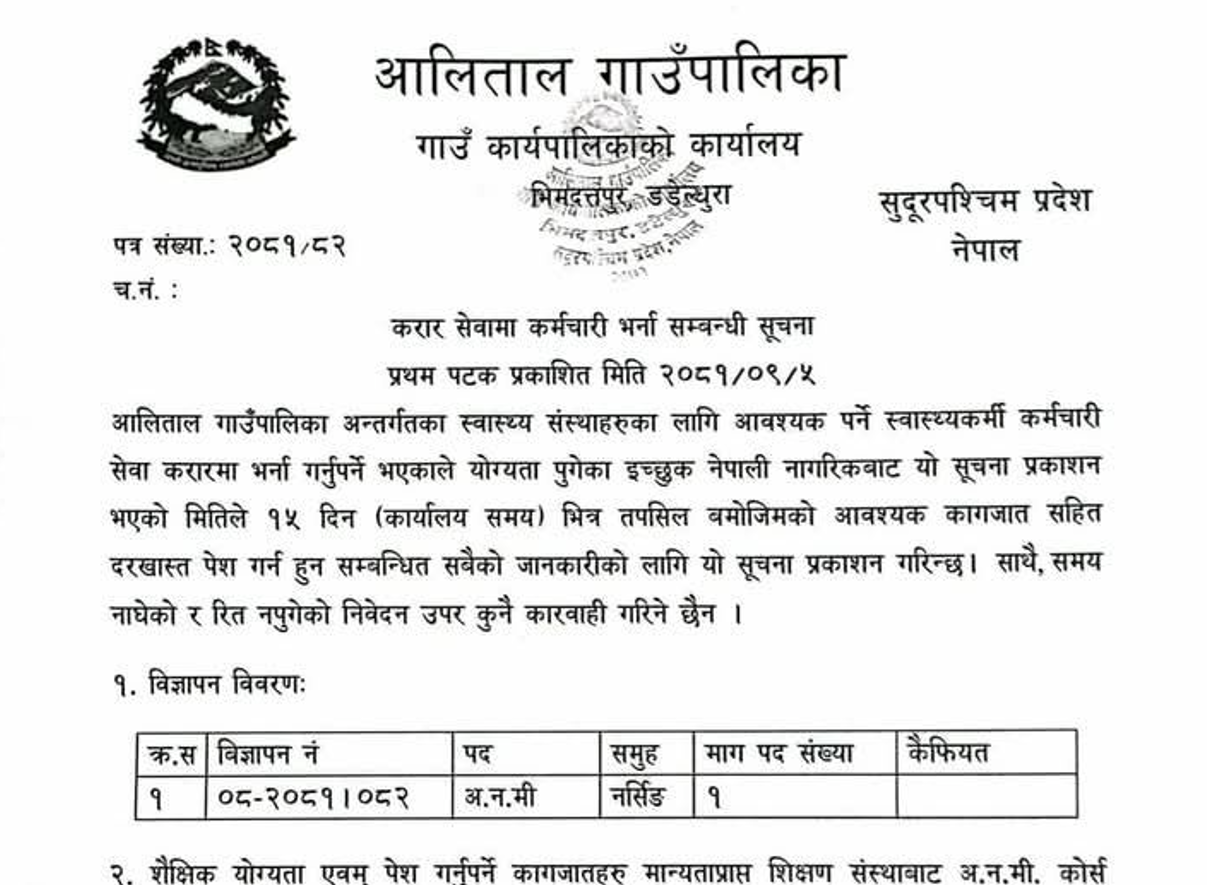 आलीताल गाउँपालिकामा अ.न.मी. आवश्यकता सम्बन्धी सूचना