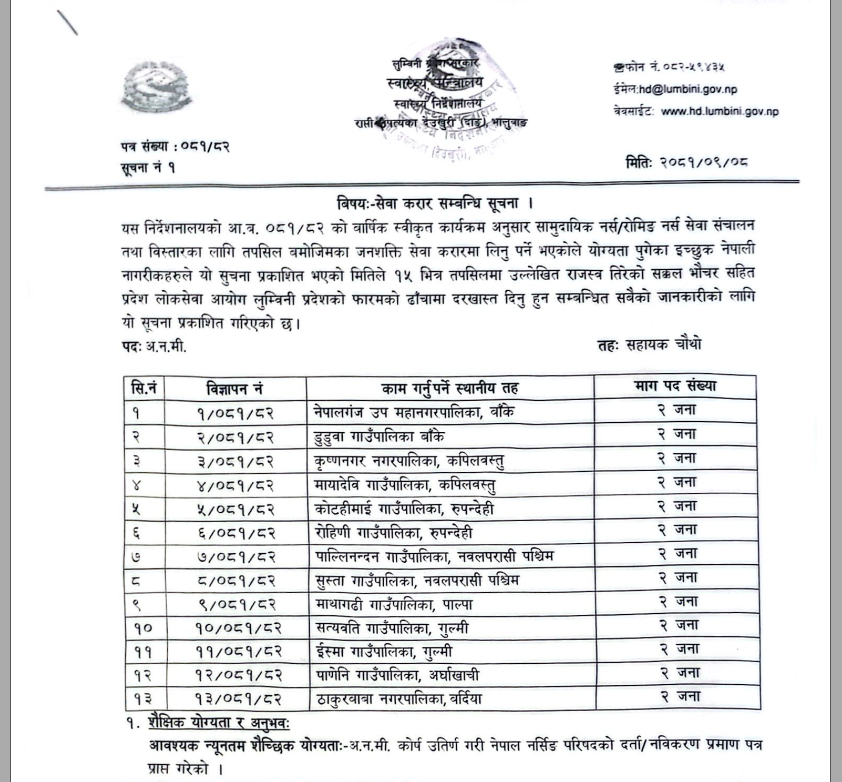 २६ जना अ.न.मी. (रोमिङ नर्स) करार सेवामा आवश्यकता सम्बन्धी लुम्बिनी प्रदेश स्वास्थ्य निर्देशनालयको सूचना