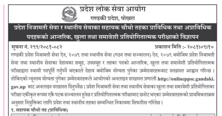 गण्डकी प्रदेश लोक सेवा आयोगको प्रदेश निजामती सेवा र स्थानीय सेवाका सहायक चौथो तहका प्राविधिक तथा अप्राविधिक पदहरूको आन्तरिक, खुला तथा समावेशी प्रतियोगितात्मक परीक्षाको विज्ञापन