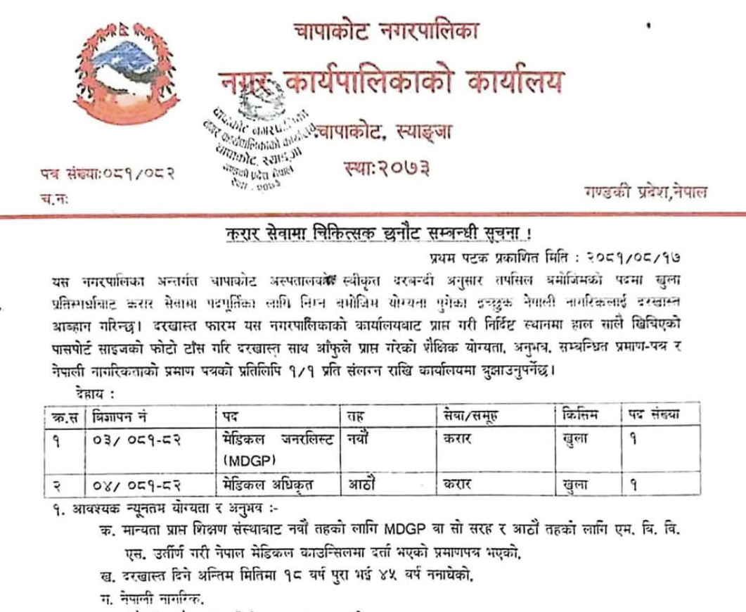 चापाकोट नगरपालिका स्याङ्जामा चिकित्सक आवश्यकतासम्बन्धी सूचना