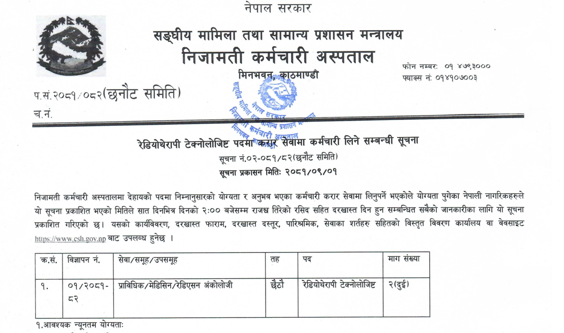 निजामती कर्मचारी अस्पतालमा कर्मचारी आवश्यकता सम्बन्धी सूचना