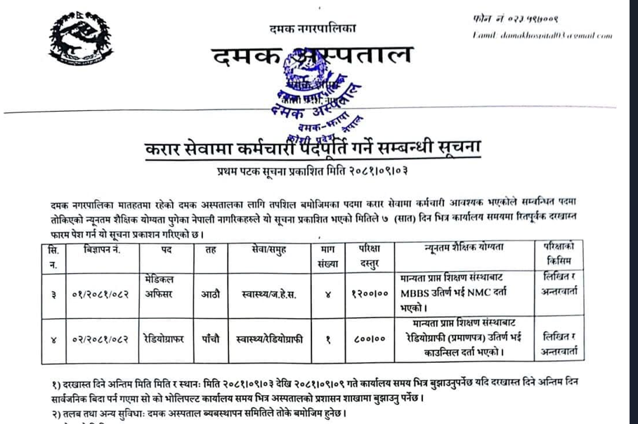 दमक अस्पताल झापामा कर्मचारी आवश्यकता सम्बन्धी सूचना