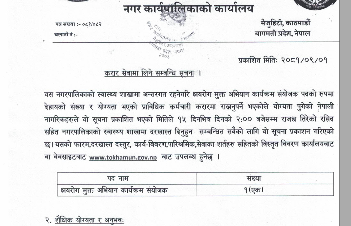 टोखा नगरपालिकामा क्षयरोगमुक्त अभियान कार्यक्रम संयोजक आवश्यकता सम्बन्धी सूचना