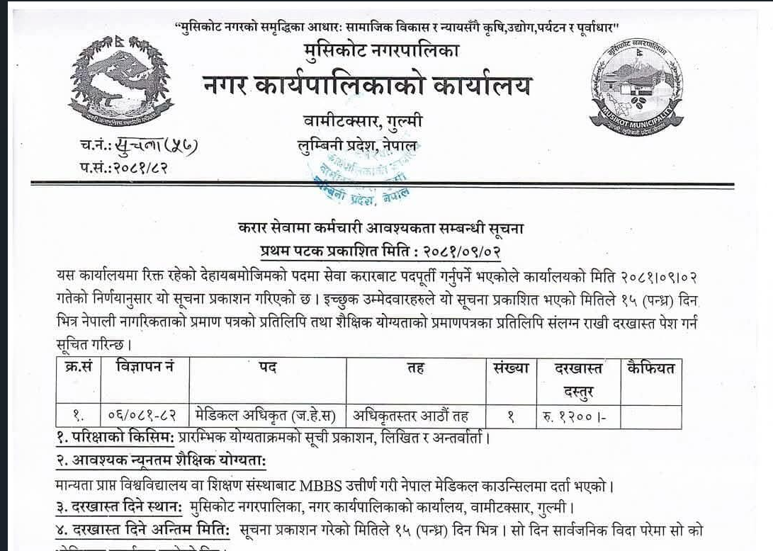 मुसिकोट नगरपालिका गुल्मीमा मे.अ. करारमा आवश्यकता सम्बन्धी सूचना