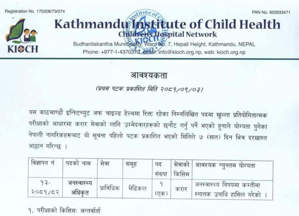 KIOCH मा जनस्वास्थ्य अधिकृत आवश्यकता सम्बन्धी सूचना