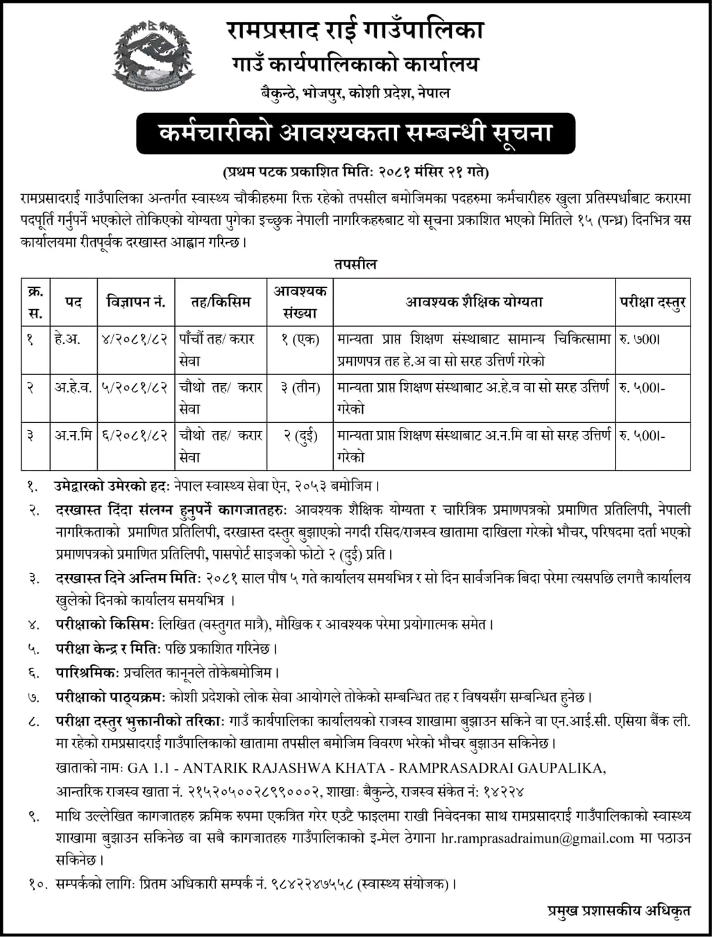 रामप्रसादराई गाउँपालिकामा स्वास्थ्यकर्मी आवश्यकता सम्बन्धी सूचना !