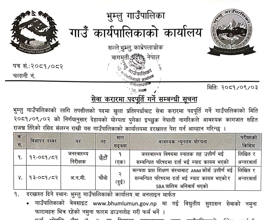 भुम्लु गाउँपालिका काभ्रेमा जनस्वास्थ्य निरीक्षक र अ.न.मी. आवश्यकता सम्बन्धी सूचना