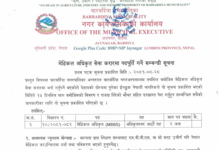 बारबर्दिया नगरपालिकामा मे.अ. आवश्यकता सम्बन्धी सूचना