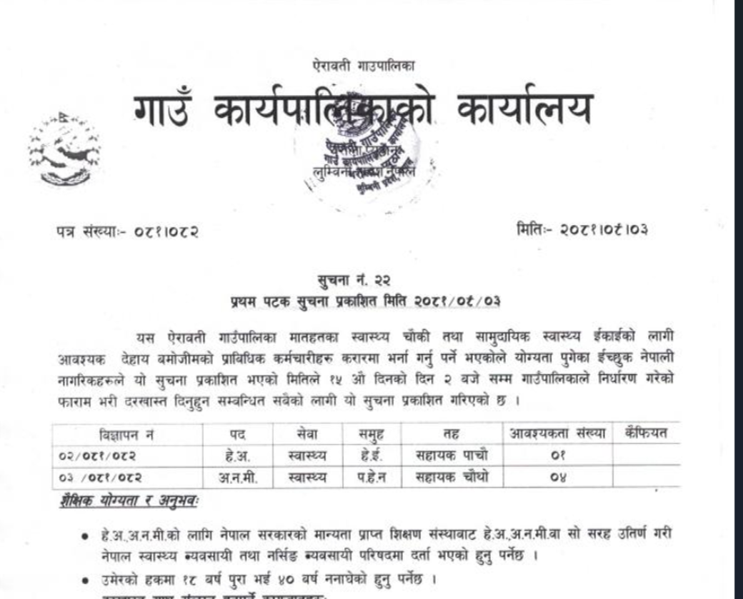 ऐरावती गाउँपालिका प्यूठानमा कर्मचारी आवश्यकता सम्बन्धी सूचना