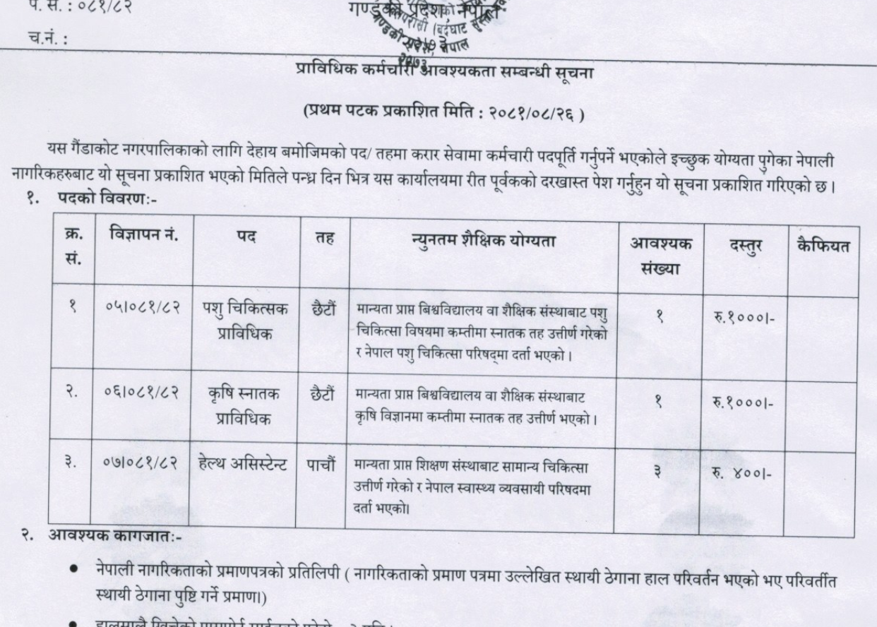 गैँडाकोट नगरपालिकामा कर्मचारी आवश्यकता सम्बन्धी सूचना