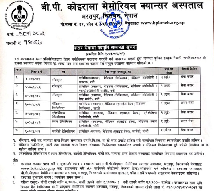बी.पी. कोइराला मेमोरियल क्यान्सर अस्पतालमा कर्मचारी आवश्यकता सम्बन्धी सूचना