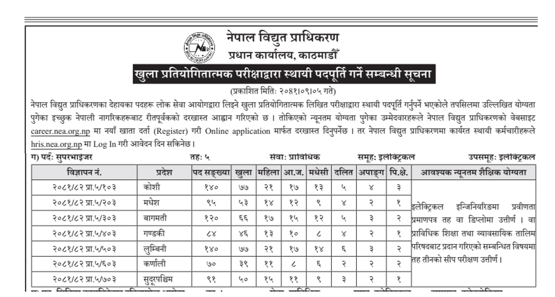 नेपाल विधुत प्राधिकरणको विभिन्न पदमा खुला प्रतियोगितात्मक परीक्षाद्वारा (९५३ जना) स्थायी पदपूर्ति गर्ने सम्बन्धी सूचना