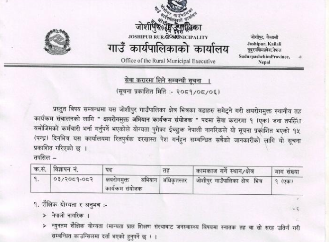 जोेशीपुर गाउँपालिकामा क्षयरोगमुक्त अभियान कार्यक्रम संयोजक आवश्यकता सम्बन्धी सूचना