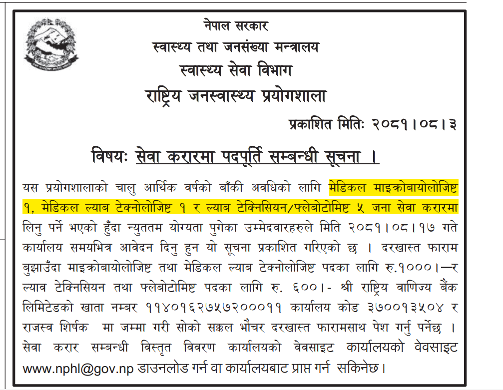 राष्ट्रिय जनस्वास्थ्य प्रयोगशालामा कर्मचारी आवश्यकता