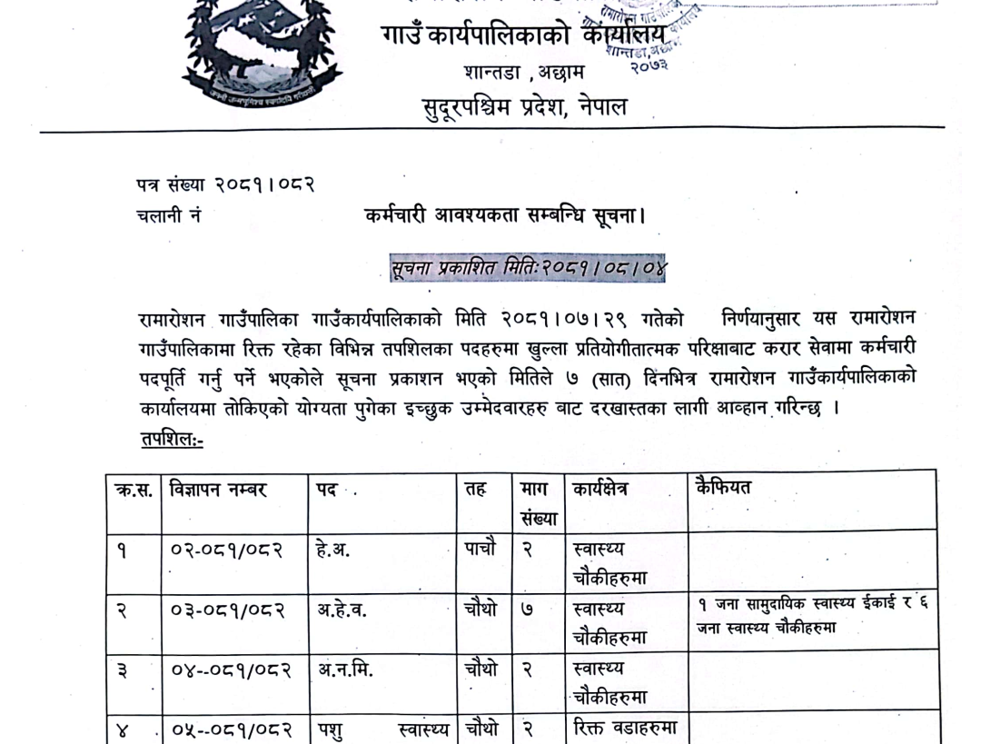 रामारोशन गाउँपालिका अछाममा कर्मचारी आवश्यकता सम्बन्धी सूचना