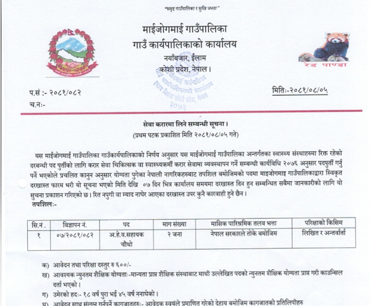 माईजोगमाई गाउँपालिका ईलाममा २ जना अ.हे.व. आवश्यकता सम्बन्धी सूचना