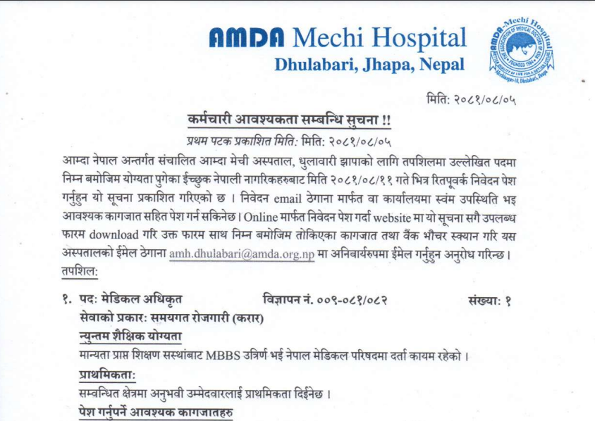 Vacancy Announcement For The Post Of Medical Officer At Amda Hospital