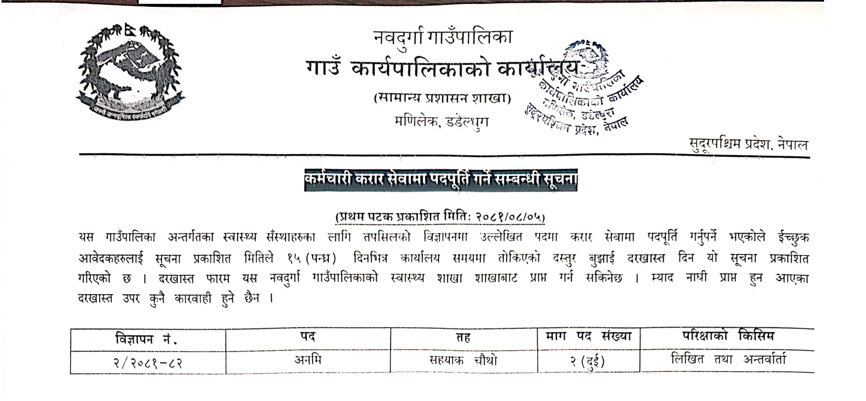 नवदुर्गा गाउँपालिका डडेल्धुरामा अ.न.मी. आवश्यकता सम्बन्धी सूचना
