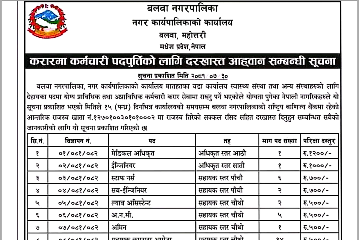 बलवा नगरपालिकामा कर्मचारी आवश्यकता