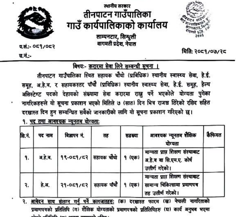 तिनाटन गाउँपालिका, सिन्धुलीमा हे.अ. र अे.हे.व.आवश्यकता सम्बन्धी सूचना !
