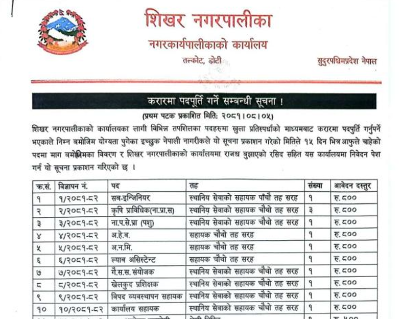 शिखर नगरपालिका डोटीमा स्वास्थ्यकर्मी लगायतका प्राविधिक कर्मचारी आवश्यकता सम्बन्धी सूचना