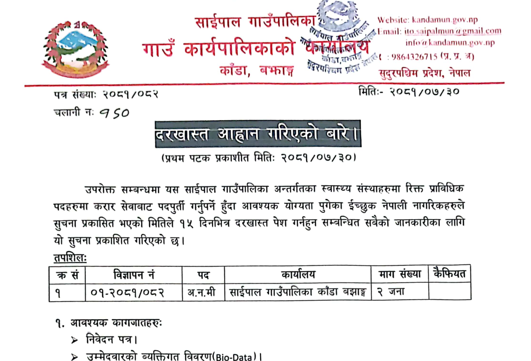 साईपाल गाउँपालिकामा अ.न.मी. आवश्यकता सम्बन्धी सूचना