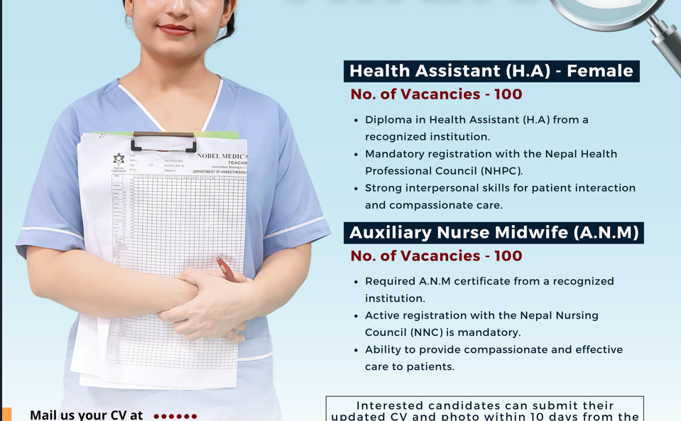 नोबेल मेडिकल कलेज Teaching Hospital मा १०० जना महिला हे.अ. र १०० जना अ.न.मी. आवश्यकता सम्बन्धी सूचना