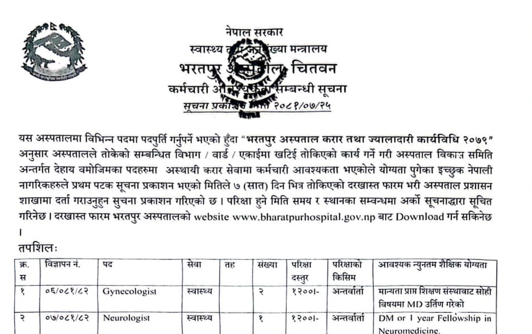 भरतपुर अस्पतालमा कर्मचारी आवश्यकता सम्बन्धी सूचना